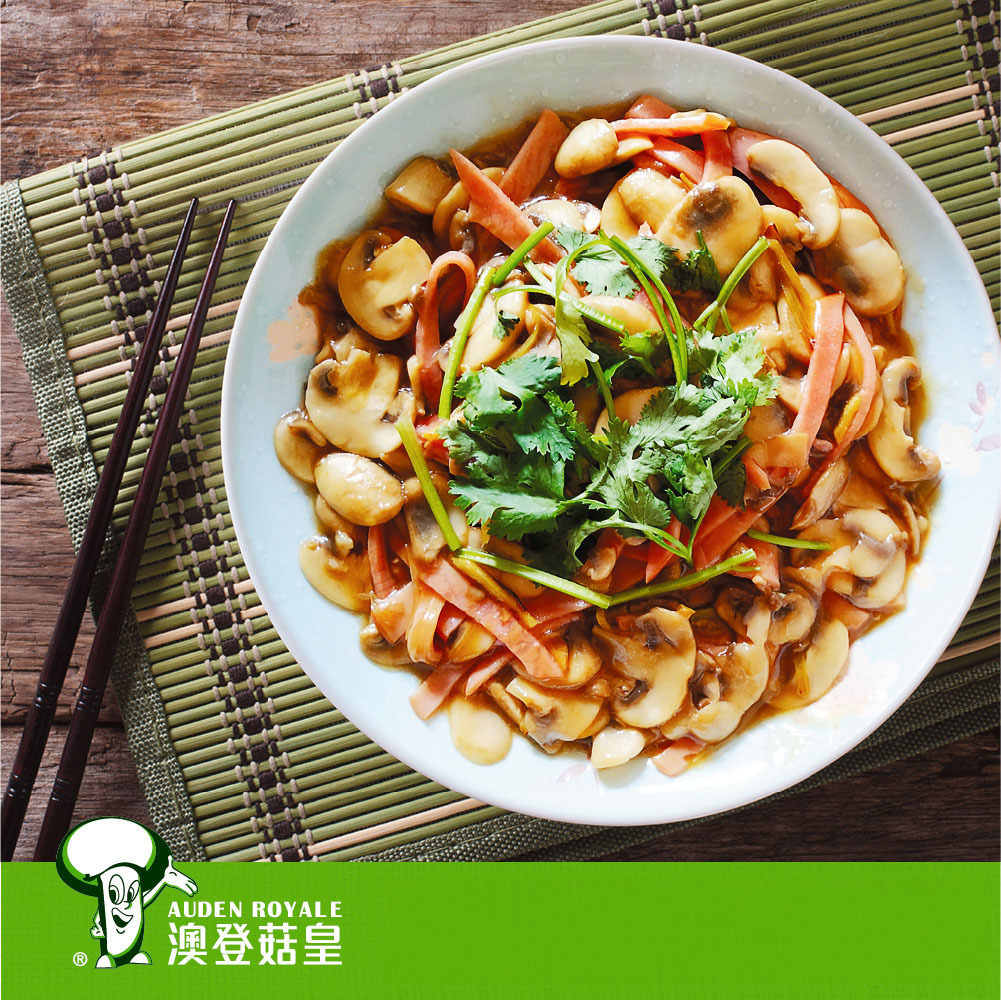 2、Heat the pot and add the peanut oil, and then put the Onions, ginger stir-fried until fragrant, add mushroom and ham, salt, soy sauce, sugar stir-fried until flavor, thicken with wet starch hook dilute solution, and spread the parsley, stir evenly and then put them on the plate.