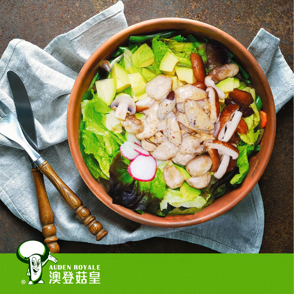 用攪拌機混合香菜、2湯匙水,醋,打成均勻的果泥。然後慢慢加入橄欖油混合拌勻。最後將蘑菇、牛油果片和拌好的醬料調勻即可享用!